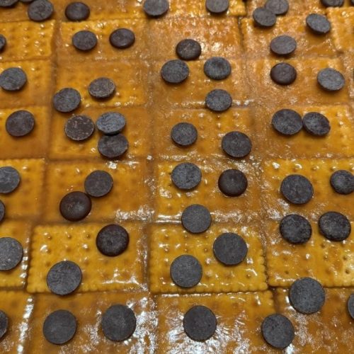 Cette recette peut paraître imprécise, mais tout dépend du nombre de craquelins que vous aurez, de leur taille et de la grandeur de votre plaque à biscuits. Pour ma part, j’aime utiliser les craquelins Tartinables, car ils sont rectangulaires, ce qui fait qu’ils sont faciles à disposer bien à plat sur ma plaque à biscuits.